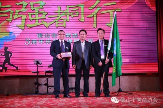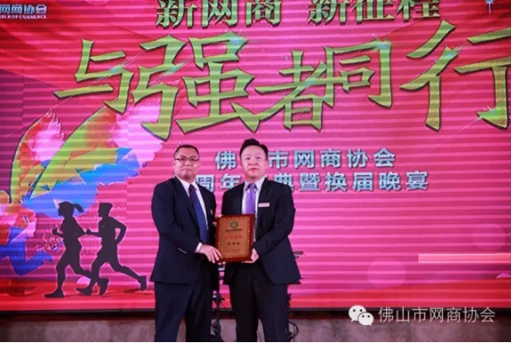 協會一路走來,都在用實際的行動幫助和影響更多的企業。協會的建設與發展,也離不開各級政府領導和社會各界人士的大力支持。活動當天,在佛山網商協會三周年慶典暨換屆大會中,我們榮幸邀請到佛山市商務局副局長李竟灤先生作為我們換屆的見證人,從老會長陳君標先生手中接過的網商協會會旗及會長寶箱移交給新會長黃小剛先生;與此同時,佛山市工商業聯合會副主席李德先生上臺向黃小剛會長頒發了任職證書。