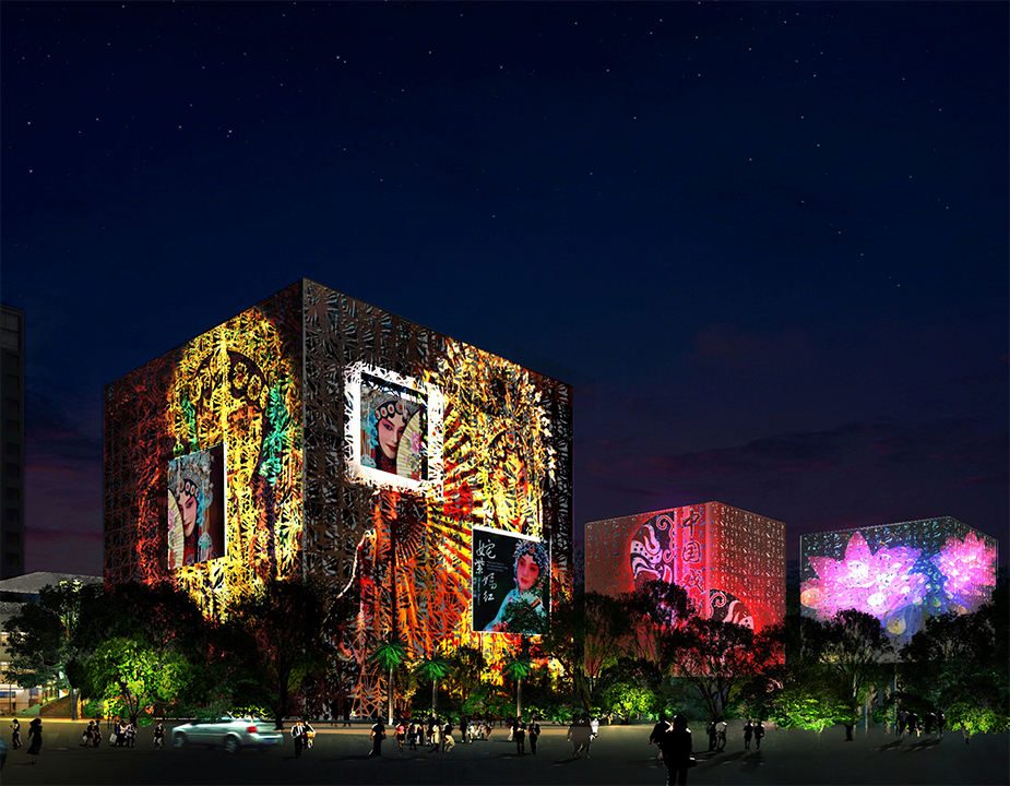 首次將中國傳統戲曲元素融入照明設計中,根據城區的結構特點,合理的考慮景觀節點、景觀點與被景觀點,通過片區、軸線的功能合理控制亮度分別,結合主題定位,滿足市民、游人游覽,休閑的日常需求,以照明夜景打造“文化靜態”、“商業動態”兼備的魅力新城。