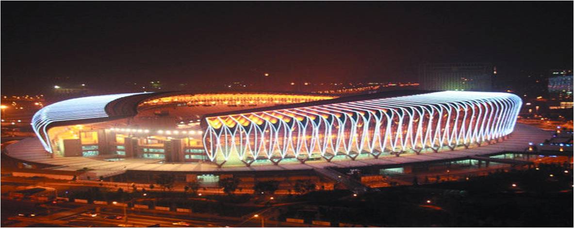 濟南奧體中心,是中華人民共和國第十一屆運動會主賽場,結合地形地勢,在西場區布置體育場,東場區布置體育館、游泳館、網球館。東區的場館布局,以圓形體育館為中心,游泳館、網球館以對稱的體型環抱體育館,從而與西場區的體育場實現了空間及體量上的雙軸對稱。中心區平臺,賽時平臺下為新聞中心,賽后將成為較好的商業運營空間。體育場、體育館、游泳館及網球館周圍設置了觀眾疏散平臺,普通觀眾在平臺以上活動。賽時,貴賓、運動員等由平臺下進入場。