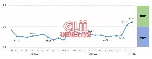 中國輕工業經濟運行及預測預警系統數據顯示:2017年3月份中輕景氣指數為91.08,較上月提高0.69點,該指數自今年年初重回綠色“穩定”區間,說明本年開年,輕工業經濟運行有企穩回暖態勢。
