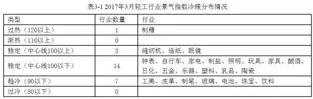 2017年3月,中國輕工業信息中心對全國輕工行業25個行業進行監測,制糖行業景氣度波動較大,由去年末“過冷”區間躍升到“過熱”區間;照明電器行業在“穩定”區間;工美、皮革、制筆、玻璃、電池、珠寶、飲料等行業處于“趨冷”區間。整體行業景氣情況如下: