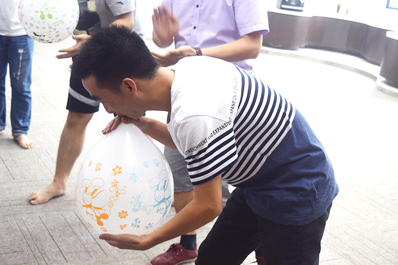 關,氣球爆破。看誰氣足,氣球破的快,很明顯紅隊是領先的一組。但藍隊后來居上,領先獲得關的勝利。