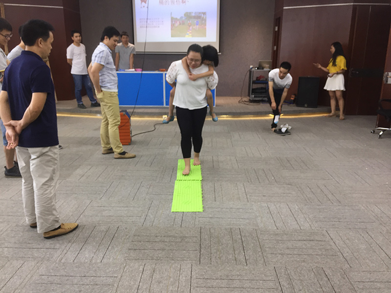 第三關,蒙眼吃櫻桃,這關考的是隊員們的默契和配合,先是隊員快速地幫忙把眼睛蒙上,然后 誰先在指壓板上蒙眼轉五個圈后走到終點把櫻桃吃了就成為前三關的終贏家。