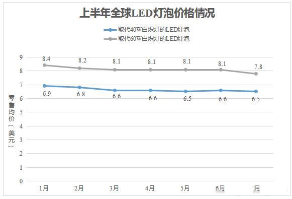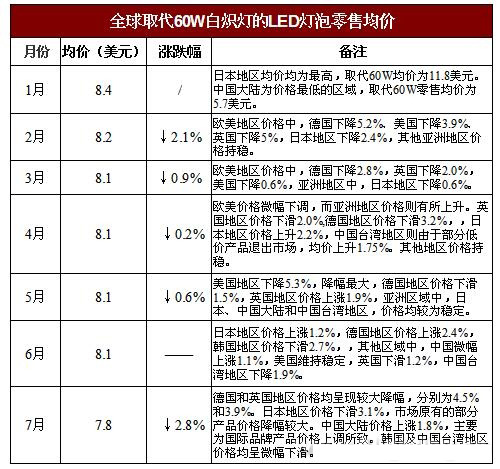 ? 雖然去年迎來罕見的逐輪價格上漲潮,上游材料、芯片、封裝、物流、人工等方面不同程度地上調價格,但今年以來,普通LED燈泡的價格依然總體呈下降趨勢,國外大廠以低價促銷、低價新品搶市,其中LED燈絲燈在歐美的盛行,也使LED燈泡價格競爭壓力增大,價格被迫下跌。日本地區均價維持在較高水平,中國經過前兩年的惡戰,價格下滑趨勢也趨緩,均價較為平穩。