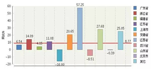 ? 從增速情況來看,廣東在全國照明行業主產區中居第六位。見下圖。