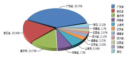? 2017年1~6月全國燈具及照明裝置行業累計產量地區占比情況