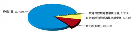 ?2017年上半年,全國照明行業完成累計出口額189.91億美元,同比增長15.06%。其中,照明燈具完成累計出口額154.95億美元(占81.59%),同比增長23.77%;電光源(燈泡)完成累計出口額20.05億美元(占10.56%),同比增長-10.71%;自供能源的照明器具及其零件完成累計出口額12.42億美元(占6.54%),同比增長-10.92%;放電燈或放電管用鎮流器完成累計出口額2.49億美元(占1.31%),同比增長-28.14%。