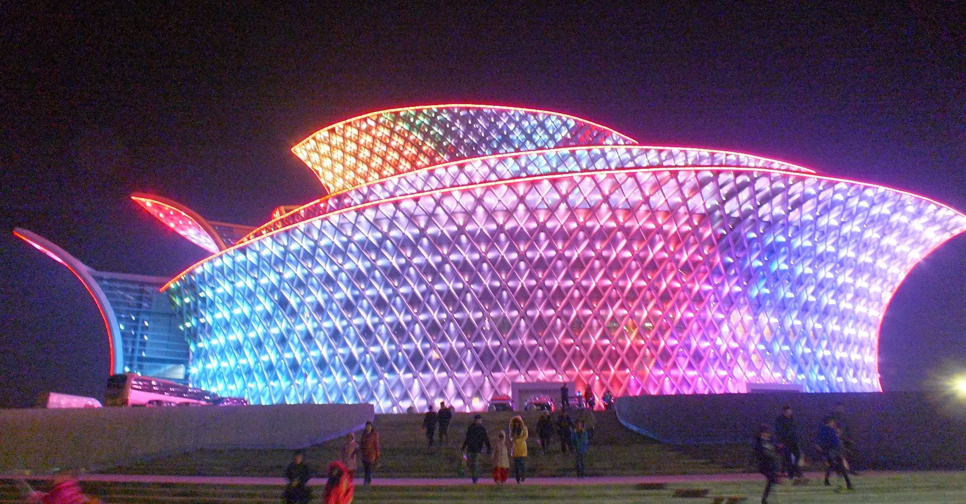 東營雪蓮大劇院外圍由彩色LED燈點綴,“花瓣”邊沿配以七彩流燈,在東營的夜空劃出一道道靚麗奪目的光線,與地面旋轉流燈交相輝映,從空中俯視猶如雪蓮旋轉般絢麗繽紛,東營雪蓮大劇院位于東城勝利大街以東,廣利河以南,南二路以北。東西長約560米,南北長約530米,總用地面積29.724公頃,總建筑面積45094平方米,其中地上35807平方米,地下9287平方米,建筑基地總面積12557平方米,綠地面積181600平方米,其中水面面積58700平方米,建筑高度46.25米,道路廣場面積83500平方米,設有923個機動車停車位,其中小客車913個(含無障礙停車位4個,大客車10個),外圍水系同廣利河、清風湖相連接,游船區暢通無阻,劇院外圍全部使用鋼筋骨架,以玻璃幕墻做裝飾,劇院舞臺音響燈光均采用國內外新設備,主舞臺包括五塊可上下移動平臺,設備先進,變化多樣。