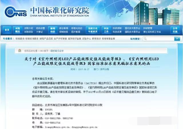 ?? 9月27日,中國標準化研究院在其網站上發布《關于對《室外照明用LED產品能效限定值及能效等級》、《室內照明用LED產品能效限定值及能效等級》國家標準征求意見稿征求意見的函》,請各有關單位抓緊組織審閱,并于2017年10月15日前將《征求意見稿回函意見表》寄回或以電子郵件的形式返回。