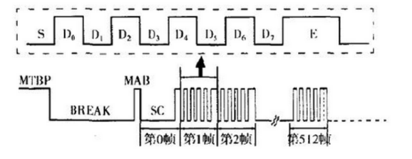 一個(gè)完整的DMX512信息包(Packet)由一個(gè)MTBP位、一個(gè)Break位、一個(gè)MAB位、一個(gè)SC和512個(gè)數(shù)據(jù)幀構(gòu)成。MTBP(Mark Time Between Packets)標(biāo)志著一個(gè)完整的信息包發(fā)送完畢,是下一個(gè)信息包即將開(kāi)始的“空閑位”,高電平有效。Break為中斷位,對(duì)應(yīng)一個(gè)信息包結(jié)束后的程序復(fù)位階段,寬度不少于兩個(gè)幀(22比特)。程序復(fù)位結(jié)束后應(yīng)發(fā)送控制數(shù)據(jù),但由于每一個(gè)數(shù)據(jù)幀的位(即開(kāi)始位)為低電平,所以必須用一個(gè)高電平脈沖間隔前后兩個(gè)低電平脈沖,這個(gè)起間隔、分離作用的高電平脈沖即MAB(Mark After Break),此脈沖一到,意味著“新一輪”的控制又開(kāi)始了。SC(STart Code)意為開(kāi)始代碼幀(圖1中的第0幀),和此后到來(lái)的數(shù)據(jù)幀一樣,也是由11位構(gòu)成,除兩個(gè)高電平的結(jié)束位之外,其他9位全部是低電平,通常將其叫做第0幀或第0通道(Ch~nel No 0),可理解為一個(gè)不存在的通道(NON一~istent Channe1)。