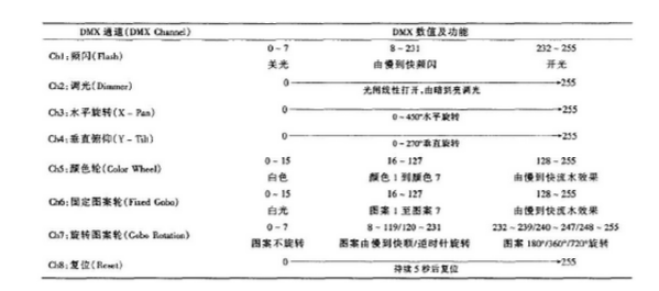 232~255對(duì)應(yīng)的二進(jìn)制組合為11101000~11111111,其他以此類推。將DMX協(xié)議中某一指令幀的部分或全部8位二進(jìn)制組合形成電腦燈某~功能轉(zhuǎn)換或狀態(tài)變化的這一過(guò)程即解碼與控制。