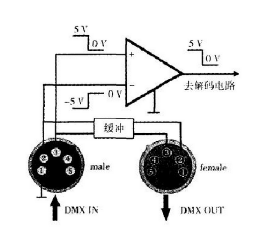 DMX512標(biāo)準(zhǔn)規(guī)定DMX接口用5芯卡依口,其中1芯接地,2,3和4,5芯傳輸控制信號(hào)(2,4為反相端,3,5為同相端),4,5芯原打算傳輸燈光設(shè)備的狀態(tài)及錯(cuò)誤檢測(cè)等信息,后來(lái)閑置不用。之所以要求用5芯卡依口而不是更為常見(jiàn)的3芯卡依口,是為了防止不小心和專業(yè)音響上常用的3芯卡依口產(chǎn)生誤連接,因?yàn)橐繇懺O(shè)備上連接電容話筒的3芯卡依口可對(duì)外提供48 v的幻像電壓,這種錯(cuò)誤連接,極易燒壞內(nèi)部電路。盡管如此,很多電腦燈還是采用了3芯卡依口,如出現(xiàn)兩種卡儂口并存的情況,要用轉(zhuǎn)接器予以正確轉(zhuǎn)接。