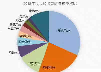從產品類型來看,2018年1月LED球泡燈產品占所有出口燈具32%,占比大。其次分別為管燈、條燈、燈條、投光燈。